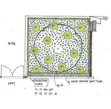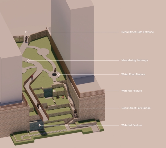 Grand yet humble, the landscape plays with scale and rhythm in a dynamic way that is in clear harmony with brownstone-inspired architecture.