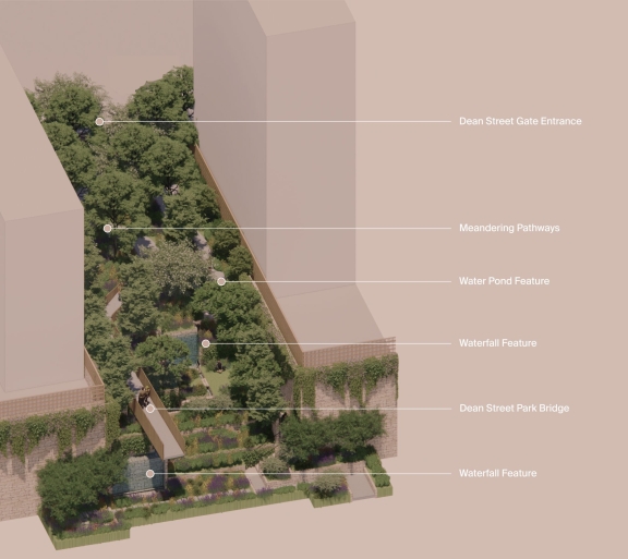 Transcendence upon arrival creates a layered experience, from the forest-like park on Dean Street to the seasonal landscaping along the front planters on Bergen Street, natural buffers bring serenity into the home. Winding paths make up Dean Street Park, leading to activated pocket parks, placing an emphasis on elements of water, wind, and fire. The abundance of green space creates a foundation for life to grow, with surprising beauty along the way. Carefully selected plant species, curated by landscape designer and horticulturist DXA Studio and Patrick Cullina, complement cascading waterfalls, offering moments of respite. Bergen prioritizes fostering a connection with the natural world for its residents, envisioning a place designed to evolve and improve over time.