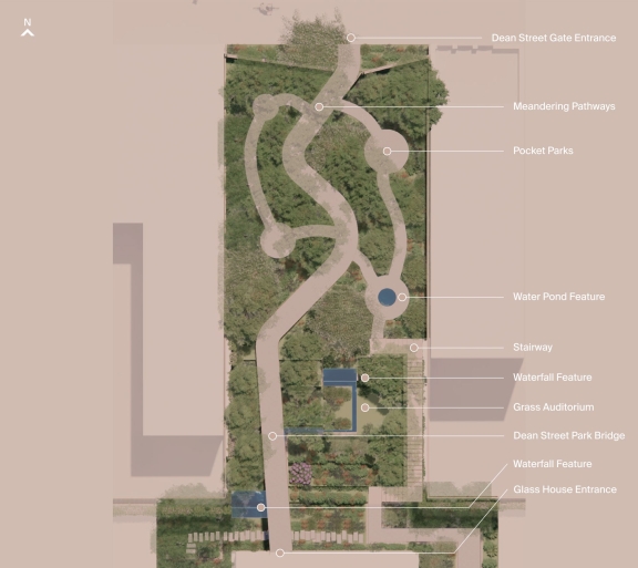 One of the four pocket parks, the water mirror serves as a place to pause, to meet, to contemplate, and to be still. Tranquil and effervescent, the intention is to complete the elemental experience with echoes of the natural world.