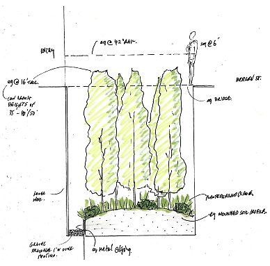 Section detail of the recessed integrated garden planters along Bergen Street.